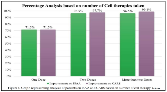 4.治療次數(shù)效果對比:根據(jù)移植BMMNCs次數(shù)(1次、2次和2次以上)觀察到,接受BMMNCs移植次數(shù)越多患者表現(xiàn)出了更好的結(jié)果,與接受1次治療的患者相比,接受2次(含2次)以上治療的患者均達(dá)到96%以上改善(圖5)。