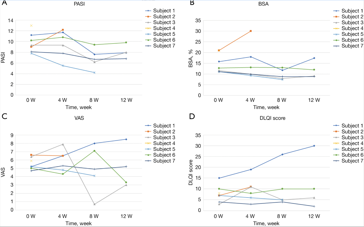 圖2:該圖顯示了7名參與者的四個結果指標,包括PASI評分、BSA、VAS 和 DLQI。