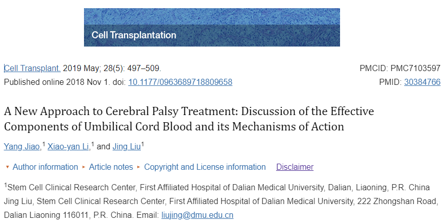 大連醫科大學第一附屬醫院干細胞臨床研究中心在一篇文章綜述中總結了臍帶血干細胞活性成分的特征及其治療腦癱的作用機制這篇綜述重點介紹了有關臍帶血干細胞移植的當前研究結果和臨床證據,這些研究結果和臨床證據有助于提供治療建議、為治療干預決策提供信息,并有助于指導未來的研究