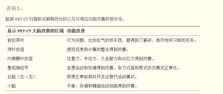 與之前的情況相比,他在矢狀面和額狀面上的體重變化有所改善;頭部、軀干和骨盆的排列也得到改善,雙側腿筋和小腿肌肉的緊繃感也有所減輕。患者開始執行雙手任務。在認知方面,由于他定期上學,他的注意力持續時間和久坐耐力也得到了改善。GMFM評分從60.67提高到67.75;GMFCS等級由Level3提升至Level2;和FIM評分從97分提高到99分。在比較第一次細胞治療之前和之后七個月期間進行的腦部PETCT掃描結果時,前扣帶葉、頂葉皮層、內側顳葉皮層、丘腦、基底神經節和小腦(表格1)。