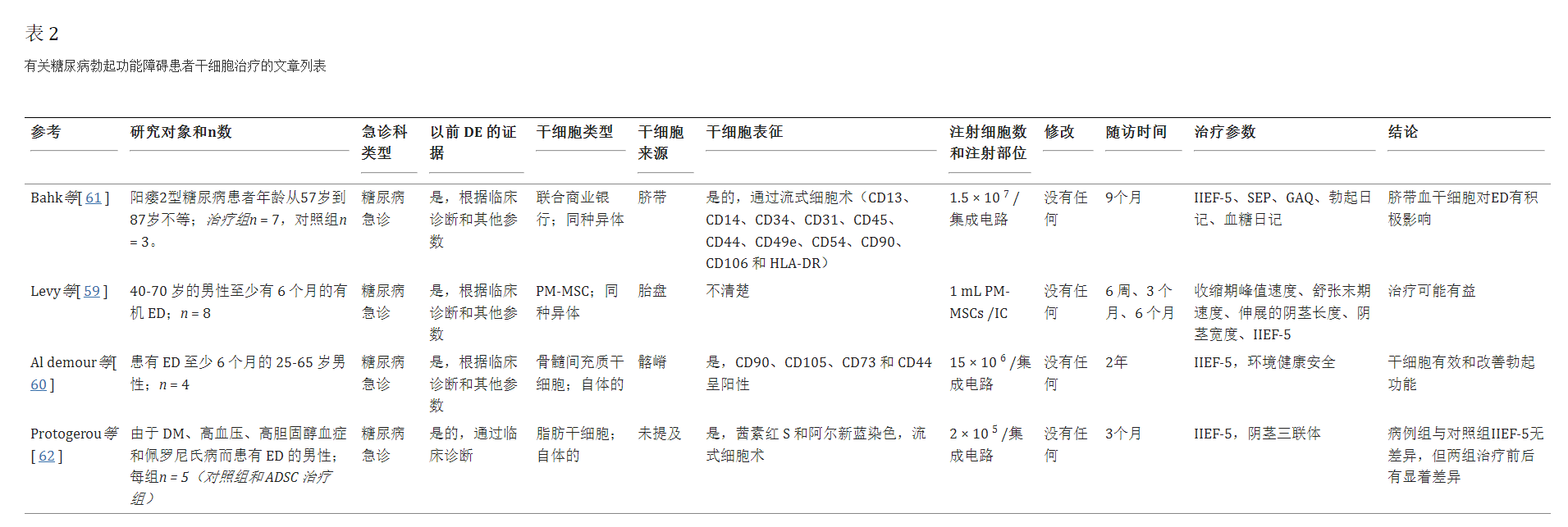 2019年,Protogerou等人報道了一種不同的方法,即使用自體脂肪干細胞治療5名DM患者的ED。將該組與其他五個接受血小板裂解物的人進行了比較。給予的干細胞數量為2×105個細胞,持續3個月。在研究結束時,在治療組和對照組之間沒有觀察到IIEF-5的差異。然而,兩組在治療前后均觀察到顯著改善。