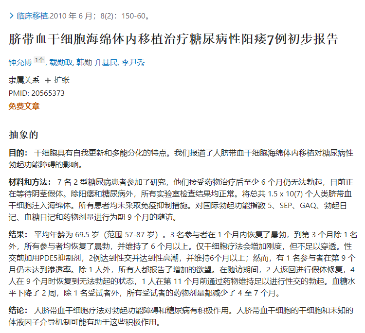 2010年,Bahk等人對7名年齡在57-87歲的糖尿病患者進行了一項研究,并將干細胞治療的效果與接受單獨PDE5抑制劑等ED治療的3名患者進行了比較。使用的干細胞是臍帶來源的間充質干細胞,劑量為1.5×107個細胞,經體內給藥。這項研究隨訪了9個月,在研究結束時,發現干細胞對ED產生了積極影響,如IIEF-5、SEP、GAQ和勃起日記的改善所示。