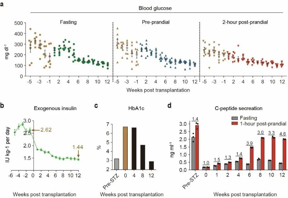 研究者將hCiPSC-islets輸注到糖尿病模型猴腹直肌前鞘下,所有接受移植的糖尿病猴的血糖控制都得到了顯著改善。