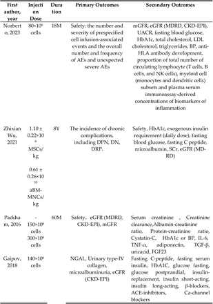 Norberto等人最近進(jìn)行了一項(xiàng)1b/2a期多中心RCT,以評估成人同種異體骨髓基質(zhì)干細(xì)胞移植對中重度DKD 患者的安全性、耐受性及治療效果。作者發(fā)現(xiàn),18周的SCT導(dǎo)致估計(jì)腎小球?yàn)V過率(eGFR)顯著改善,但不影響尿微量白蛋白/肌酐比值(UACR)。然而,Gaipov等發(fā)現(xiàn)SCT顯著降低微量白蛋白尿(MAU),而不影響eGFR或血清肌酐(SCr)水平。