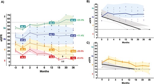 (A) 總體腎功能。從治療前3個(gè)月到治療后36個(gè)月,每位患者(彩色點(diǎn))的 eGFR(按慢性腎病類(lèi)別分組)和每個(gè)階段組的平均值(實(shí)線),4個(gè)不同患者組以陰影表示顏色(3a – 綠色;3b – 藍(lán)色;4 – 橙色;5 – 紅色)。36個(gè)月時(shí)患者組的eGFR(腎功能)總體百分比改善(+,綠色)或惡化(-,紅色)。