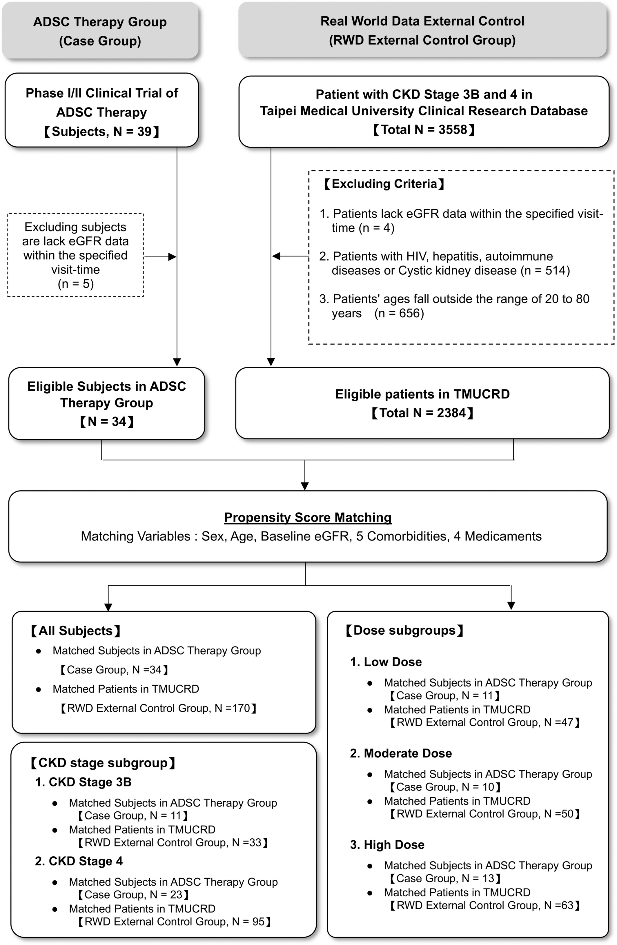 病例組為臨床試驗中符合條件(20-80歲,CKD 3b-4期)的34名患者。對照組則從TMUCRD中依據與病例組完全相同的納入與排除標準(如排除特定合并癥、未控制糖尿病等)進行初步篩選,得到2384名潛在對照。