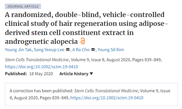 韓國的一項(xiàng)隨機(jī)、雙盲、藥物對照試驗(yàn)使用脂肪干細(xì)胞成分提取物 (ADSC-CE) 治療AGA,證實(shí)了治療效果。