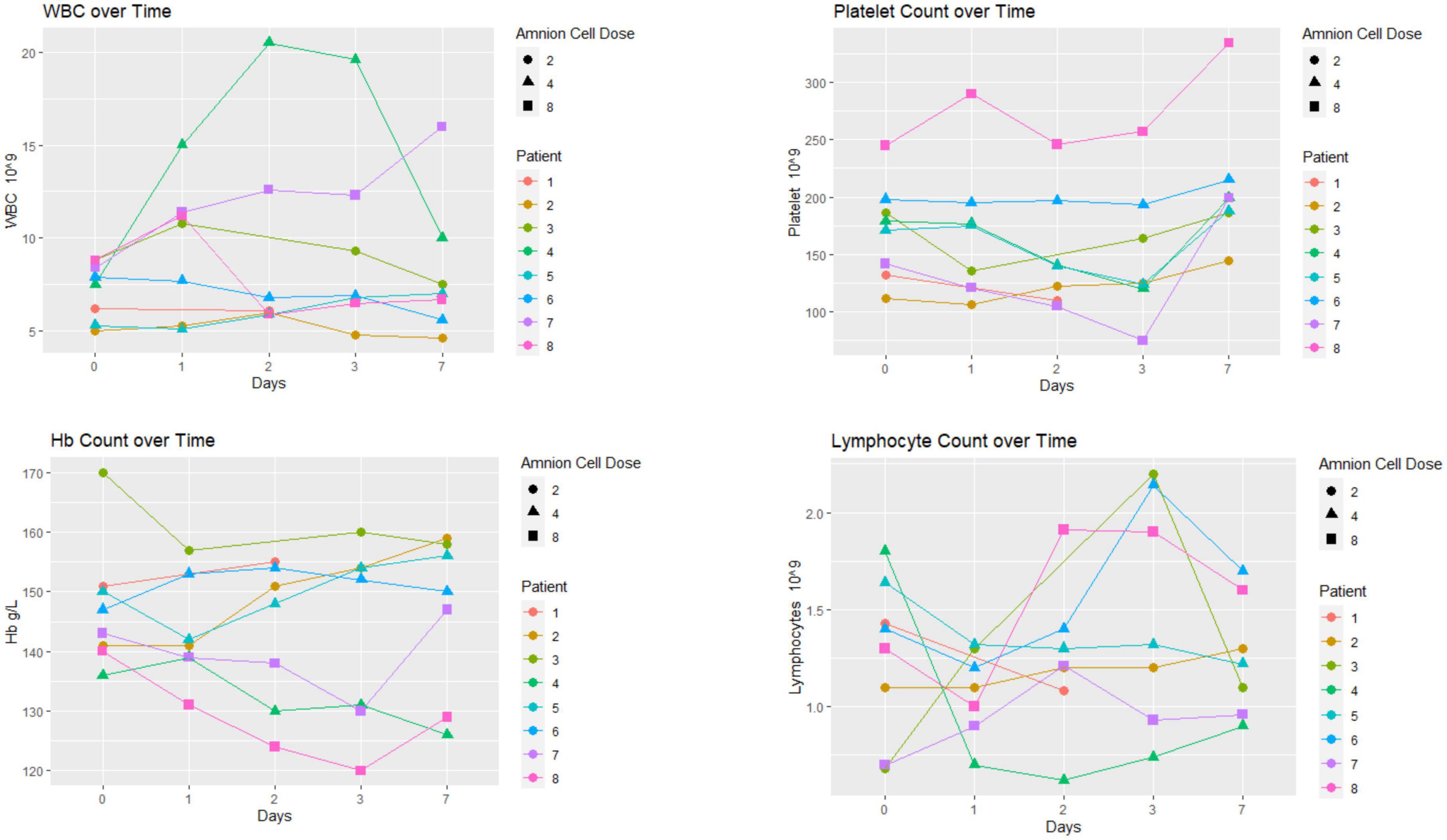 血液學變化如圖2所示。在這8名患者中沒有觀察到特殊的模式。4名患者白細胞 (WBC) 升高至10×10^9/L以上。這四名患者中有兩名的白細胞升高是暫時的。這些患者的胸部X光檢查、血液和尿液培養均正常。血紅蛋白譜未降至120g/L以下。患者7的血小板計數在第3天降至100×10^9/L以下,然后在第7天恢復正常。結果顯示患者4出現短暫性淋巴細胞減少(低于1×10^9/L)。嗜酸性粒細胞計數為0.10±0.10×基線時為10^9/L(平均值±標準差),細胞輸注后5-7天仍保持在正常范圍內 (0.15±0.10×10^9/L,n=8;數據未顯示)。
