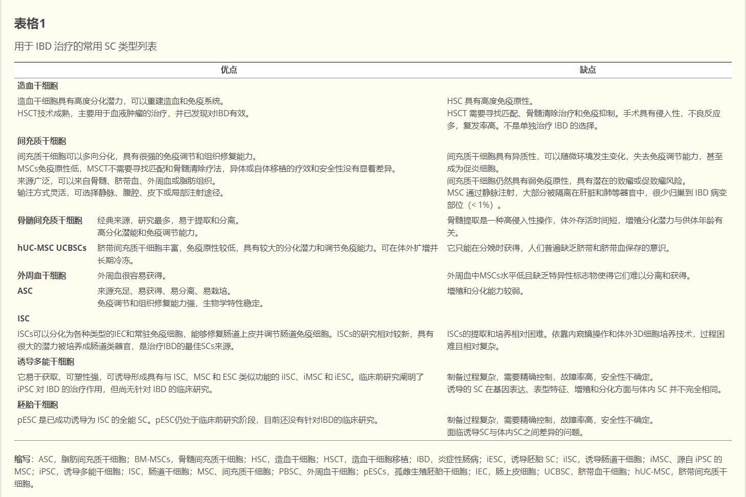 各種類型的SC,包括造血干細胞 (HSC)、MSC、ISC和誘導多能干細胞 (iPSC),已用于治療IBD。請參閱表格1查看用于IBD治療的常用SC類型列表。