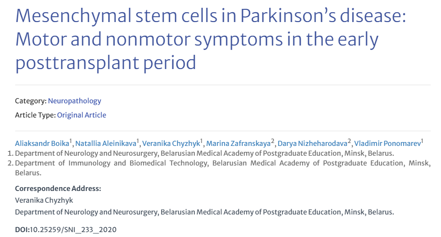 2021年,白俄羅斯研究生教育醫學院神經內科和神經外科完成了一項I期臨床試驗[NCT03550183],研究人員通過靜脈輸注使用臍帶間充質干細胞(UC-MSC)來治療PD。通過不同持續時間的隨訪,研究人員測試了治療效果和生活質量。