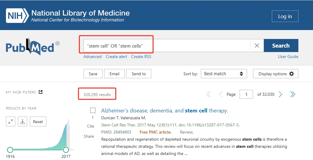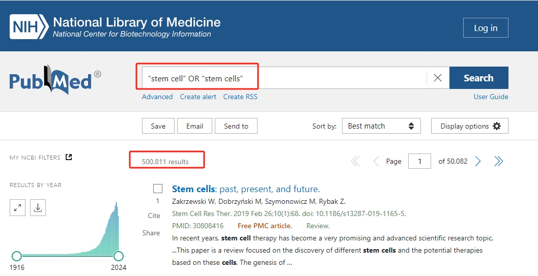 盡管起步卑微,干細胞界在本月實現了一個令人震驚的里程碑,有關干細胞的科學論文數量猛增至50萬篇以上。要親自驗證這一發現,請在PubMed上使用搜索短語(”干細胞 “和 “干細胞”),如下所示。