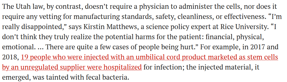 萊斯大學的科學政策專家Kirstin Matthews表示:與其他州相比,猶他州的法律不需要醫(yī)生來管理細胞,也不需要對細胞的制造標準、安全性、清潔度和有效性進行審查,政府工作人員并未認識到這對患者在經(jīng)濟上、身體上和情感上的傷害,在2017年和2018年就發(fā)生過19人因注射了市面上銷售的不受監(jiān)管的臍帶干細胞產(chǎn)品,感染住院,后被發(fā)現(xiàn),注射的材料被糞便細菌污染了。