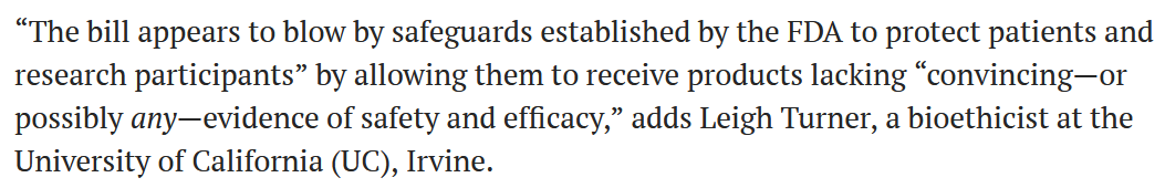 加州大學生物倫理學家 Leigh Turner表示:這一法案沖破了FDA為患者和受試者建立的安全屏障,讓他們接受缺乏安全性和有效性證據(jù)的產(chǎn)品。