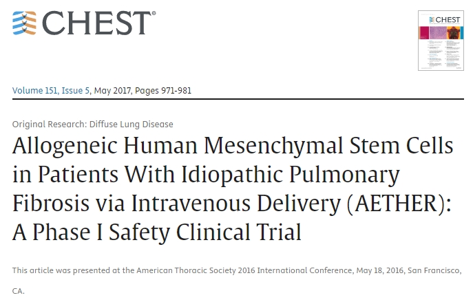 2017年,一項在PF患者中使用同種異體人間充質干細胞 (hMSC) 的I期臨床試驗評估了將年輕無親屬關系男性的骨髓hMSC靜脈注射給9名輕度至中度IPF患者的安全性。患者接受單次靜脈輸注,每次輸注20、100或2億個hMSC。