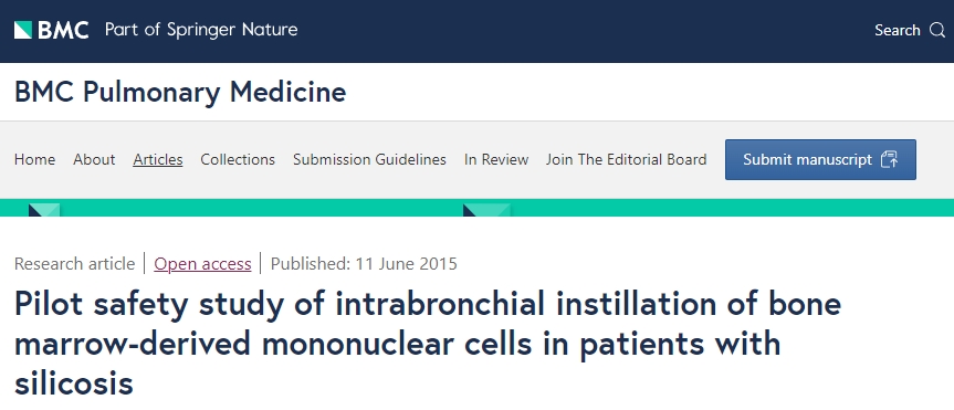 2015年,在一項評估硅肺患者氣管內灌注骨髓源性細胞療效的初步研究中,硅肺是一種由接觸二氧化硅引起的纖維化肺部疾病,對五名接受細胞治療的患者進行了為期一年的隨訪。沒有觀察到嚴重的不良反應,一些跡象表明肺灌注有所改善。作者建議可以在更大規模的試驗中進一步研究這種方法。