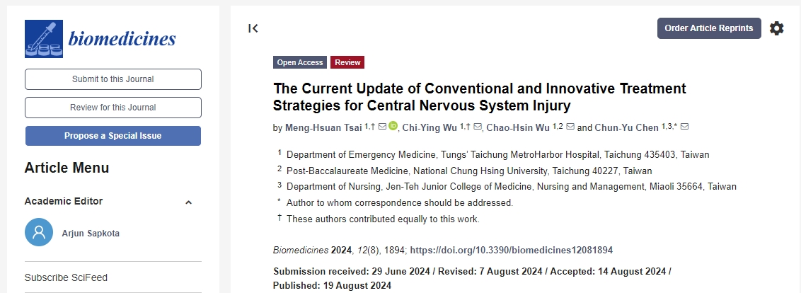 近期,期刊雜志《Biomedicines》發表了一篇常規療法、創新療法(干細胞治療)治療中樞神經系統損傷的最近進展的文章,該文章是以中國臺中市東區港灣醫院急診醫學科為牽頭的機構發表的。
