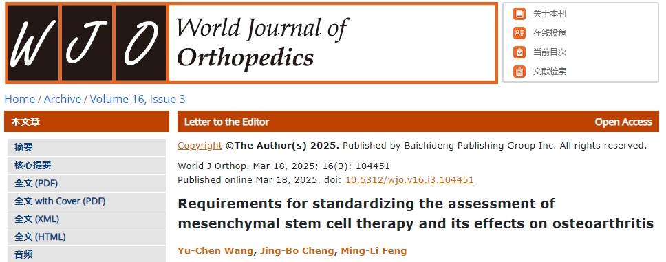參考資料:[1]:Wang YC, Cheng JB, Feng ML. Requirements for standardizing the assessment of mesenchymal stem cell therapy and its effects on osteoarthritis. World J Orthop. 2025 Mar 18;16(3):104451. doi: 10.5312/wjo.v16.i3.104451. PMCID: PMC11924026.