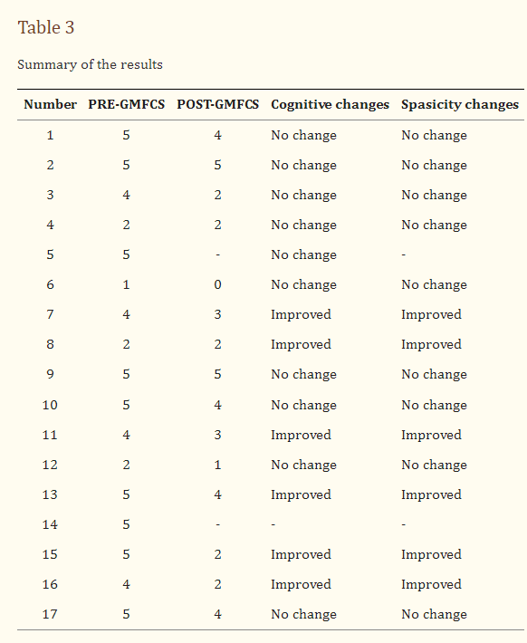 我們的數(shù)據(jù)顯示,大約73%的腦癱患者可能會(huì)從這種治療中受益。改進(jìn)范圍從0到3分,平均1.3分。還有良好的認(rèn)知、功能和大小便控制以及痙攣改善。治療必須輔之以嚴(yán)格的身體和認(rèn)知刺激。