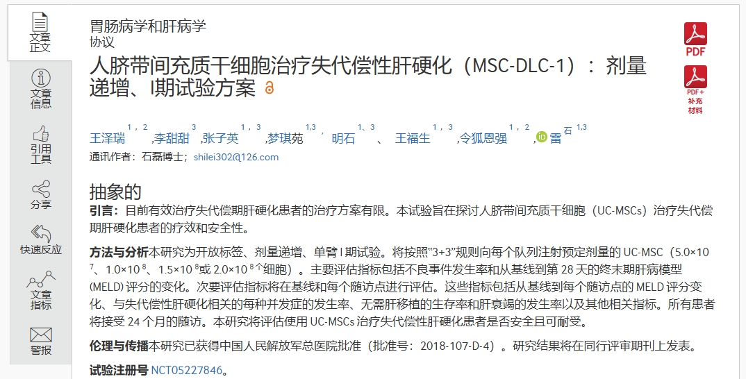 2023年,中國人民解放軍醫學院使用UCMSCs(注冊號為NCT05227846)的試驗,按照“3+3”規則,以預定劑量(范圍從5×107到2×108)單次注射UCMSCs 。