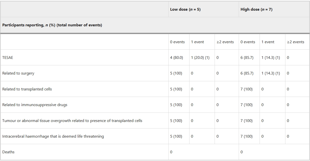 - 主要目標:評估 bemdaneprocel 細胞移植后1年的安全性和耐受性,基于不良事件發生率進行分析。