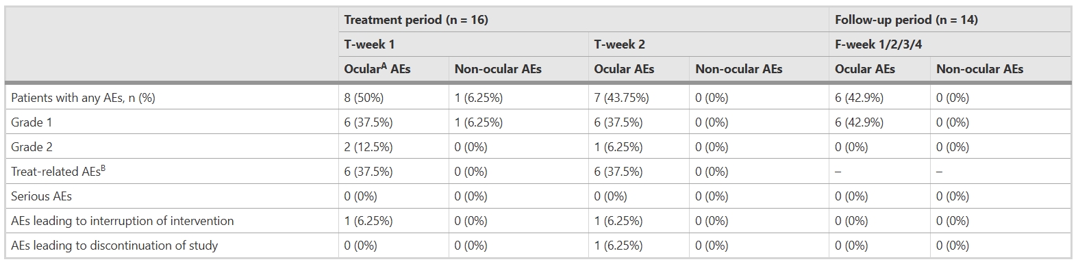 治療安全性突出:每日兩次、持續(xù)兩周用藥耐受性良好,僅一例因短暫眼部刺激退出,無(wú)嚴(yán)重不良事件。不良反應(yīng)(異物感、刺激)多與患者原有眼表?yè)p傷及神經(jīng)敏感相關(guān),且癥狀輕微、短暫。