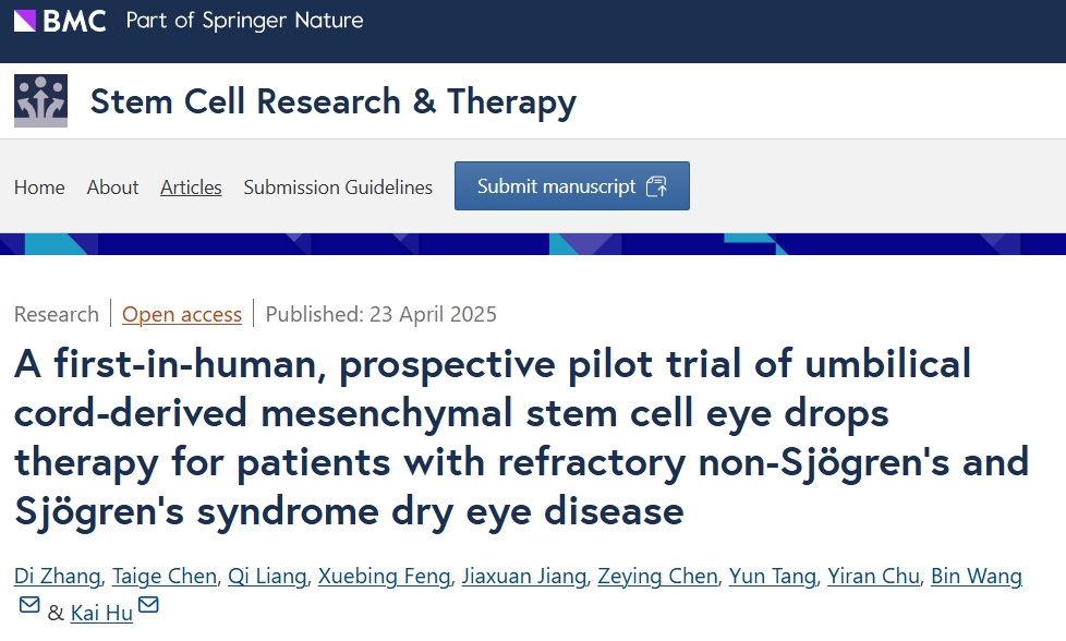 近日,南京大學(xué)醫(yī)學(xué)院附屬南京鼓樓醫(yī)院眼科和風(fēng)濕免疫科進(jìn)行了一項(xiàng)“臍帶間充質(zhì)干細(xì)胞滴眼液治療難治性非干燥綜合征和干燥綜合征干眼癥患者的首次人體前瞻性試點(diǎn)試驗(yàn)”的臨床研究,該臨床研究結(jié)果發(fā)表在期刊雜志“Stem Cell Research & Therapy”上[1]。