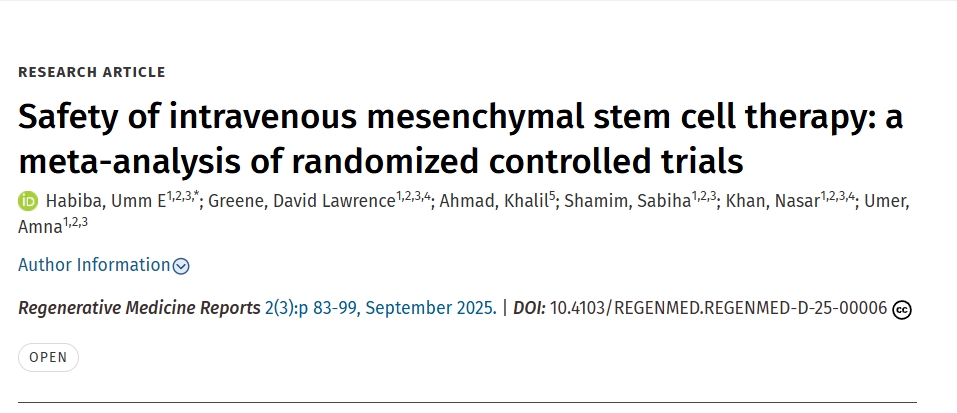 參考資料:哈比巴,烏姆 E 1,2,3,* ;大衛·勞倫斯·格林1,2,3,4;艾哈邁德、哈利勒5;沙米姆、薩比哈1,2,3;納薩爾·汗1,2,3,4;烏梅爾、阿姆納1,2,3. 靜脈間充質干細胞治療的安全性:隨機對照試驗的薈萃分析. 再生醫學報告2(3):第 83-99 頁,2025 年 9 月。DOI: 10.4103/REGENMED.REGENMED-D-25-00006