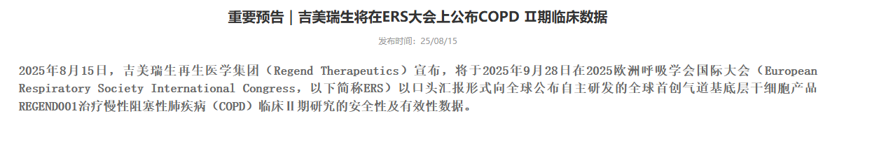 8月15日,上海瑞金落地的慢阻肺干細胞治療臨床實驗室吉美瑞生再生醫學集團(Regend Therapeutics)正式宣布,將在2025年9月28日于荷蘭阿姆斯特丹舉辦的歐洲呼吸學會國際大會(ERS)上,以口頭匯報形式向全球披露其自主研發的全球首創氣道基底層干細胞產品REGEND001,在治療慢性阻塞性肺疾病(COPD)臨床Ⅱ期研究中的安全性與有效性核心數據,為全球慢阻肺病治療領域帶來新的關注焦點。[9]