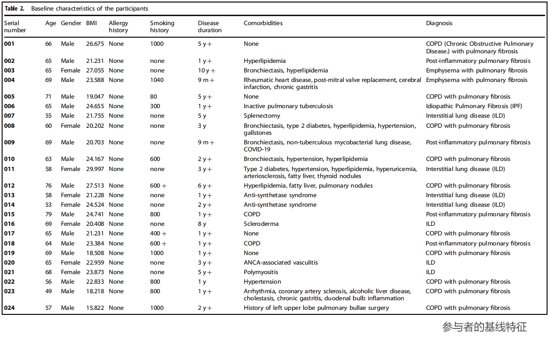 經嚴格篩選后,24例經高分辨率CT(HRCT)確診的肺纖維化患者納入研究,其中12例接受”常規治療+霧化hUCMSC-EVs”(實驗組),另12例接受”常規治療+生理鹽水霧化”(對照組)。兩組患者的基線特征無顯著差異(表1),且全程維持原治療方案,確保結果可比性。