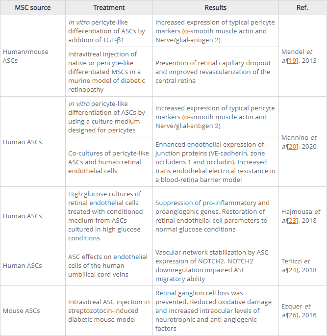 由于這些原因,許多研究都專注于開發可以在不可逆轉的損害發生之前減輕或阻止疾病進展的療法。間充質干細胞的治療幾項體外或動物模型研究表明,基于間充質干細胞的策略可能是糖尿病視網膜病變治療的寶貴工具。表1總結了主要結果。