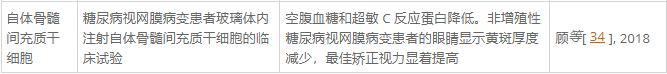 在一項試驗性臨床試驗中,評估了靜脈注射自體骨髓間充質干細胞治療增殖性或非增殖性DR患者的安全性和有效性。結果顯示,兩組患者的空腹血糖和超敏C反應蛋白均降低,而血紅蛋白A1C或IL-6水平無顯著差異。只有非增殖性DR患者的眼睛顯示出黃斑厚度減少和最佳矯正視力 (BCVA) 的顯著改善。