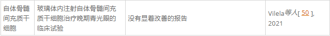 迄今為止,在臨床試驗中沒有描述任何顯著影響。在晚期青光眼患者中,玻璃體內注射自體BMSCs并未引起視力或視野的明顯改善。
