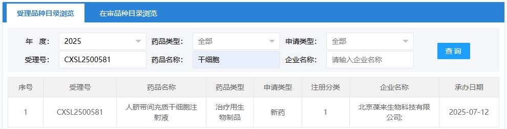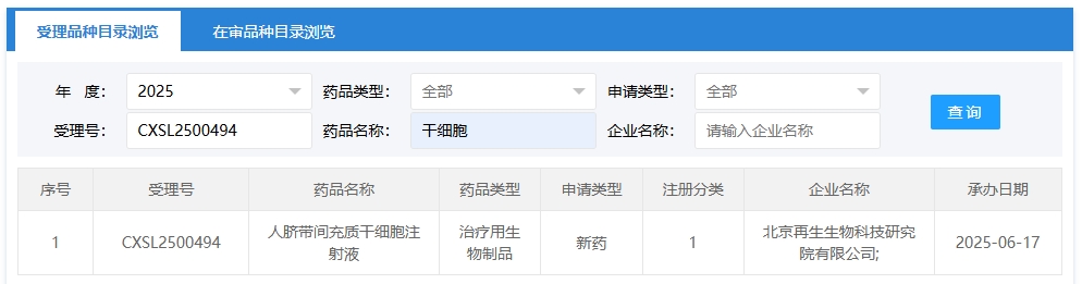 新增受理3:2025年06月17號,北京再生生物科技研究院有限公司申報的“人臍帶間充質干細胞注射液”的臨床試驗申請獲受理(受理號:CXSL2500494),這是該款細胞注射液第1次獲得受理。