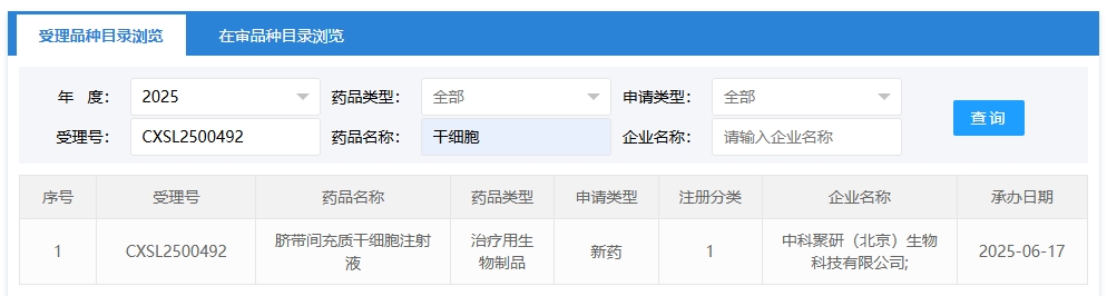 新增受理2:2025年06月17號,中科聚研(北京)生物科技有限公司申報的“臍帶間充質干細胞注射液”的臨床試驗申請獲受理(受理號:CXSL2500492),這是該款細胞注射液第1次獲得受理。