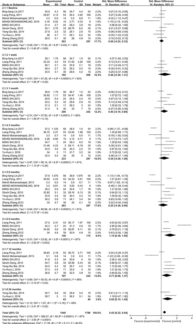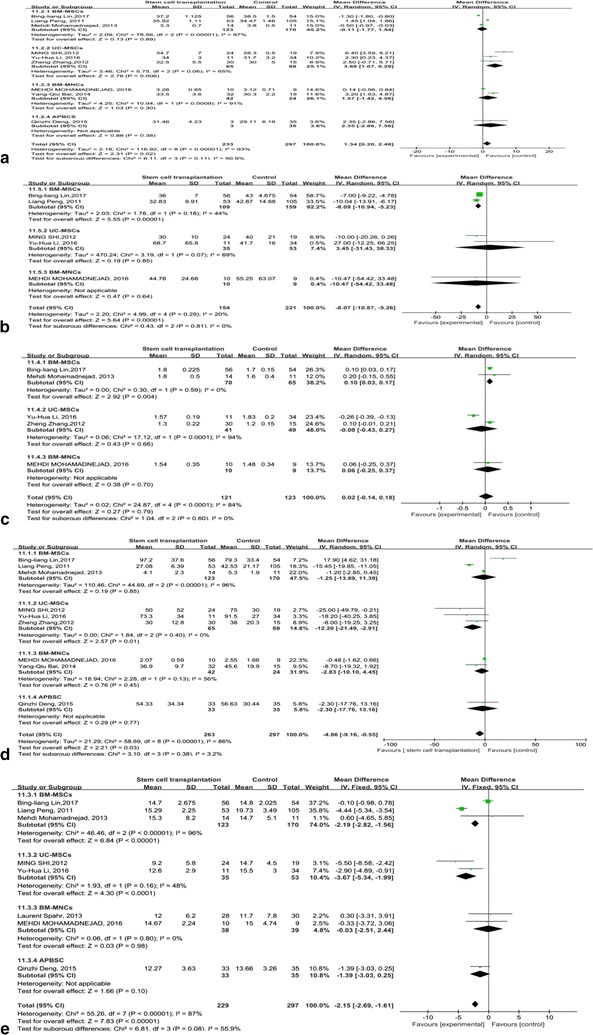 包括四項(xiàng)隨機(jī)對(duì)照試驗(yàn)和六項(xiàng)非隨機(jī)對(duì)照試驗(yàn)。干細(xì)胞治療后1、3、12個(gè)月時(shí),TBIL水平顯著下降(p=0.0008;p=0.04;p=0.007)。與對(duì)照組相比,短期內(nèi)ALT水平顯著降低 (p<0.00001)。與對(duì)照組相比,INR 水平?jīng)]有明顯變化 (p=0.64)。與對(duì)照組相比,ALB水平顯著增加 (p<0.0001)。干細(xì)胞治療組和對(duì)照組之間的MELD評(píng)分存在顯著差異 (p=0.008)。還根據(jù)干細(xì)胞類(lèi)型對(duì)3個(gè)月的臨床表現(xiàn)進(jìn)行了進(jìn)一步的亞組分析。