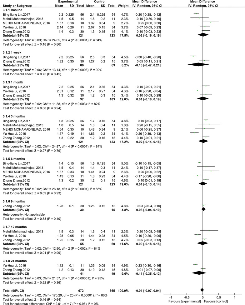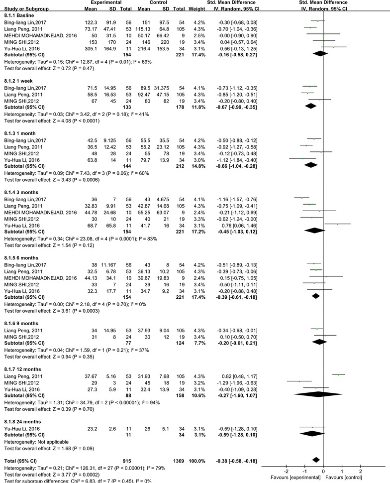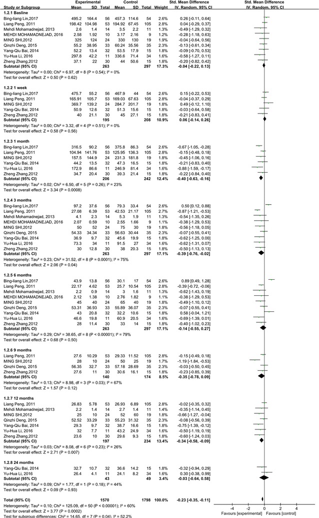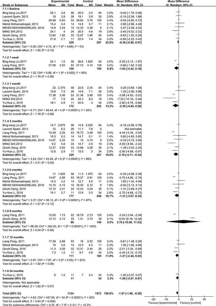 與對(duì)照組相比,干細(xì)胞治療后ALT水平顯著降低(p<0.00001)(圖5)。亞組分析顯示,干細(xì)胞治療組ALT水平也有所降低,在1周、1個(gè)月和6個(gè)月時(shí)間點(diǎn)均低于基線(xiàn)和相應(yīng)對(duì)照組。干細(xì)胞治療后9、12和24個(gè)月時(shí)ALT水平無(wú)顯著差異。關(guān)于1周、6和9個(gè)月時(shí)的ALT水平,未發(fā)現(xiàn)異質(zhì)性。但是,應(yīng)考慮1、3和12個(gè)月時(shí) ALT水平的異質(zhì)性。但這只能通過(guò)一兩項(xiàng)研究來(lái)解釋。