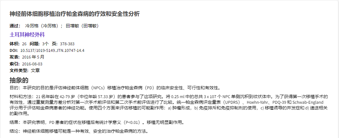 國內(nèi)在臍帶間充質(zhì)干細(xì)胞移植治療帕金森的臨床研究也已取得了許多可喜的臨床效果,已查詢到多篇應(yīng)用臍帶間充質(zhì)干細(xì)胞治療帕金森疾病的臨床研究文獻(xiàn):