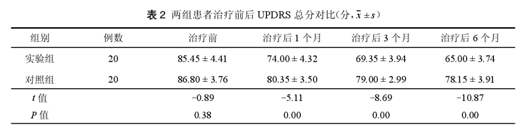 福州總醫(yī)院趙堂亮等選取20例患者經(jīng)鞘內(nèi)注射臍帶間充質(zhì)干細(xì)胞治療為實(shí)驗(yàn)組,另選取20例經(jīng)口服左旋多巴治療原發(fā)性帕金森病患者為對照組。采用PD統(tǒng)一評分量表(UPDRS)對患者治療前及治療后1個月、3個月、6個月進(jìn)行量化評分。結(jié)果顯示實(shí)驗(yàn)組20例患者臨床癥狀緩解程度較對照組明顯,結(jié)果如圖