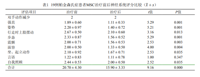 蘭州軍區(qū)蘭州總醫(yī)院干細(xì)胞治療中心[6]收治19例PD患者,給予鞘內(nèi)注射臍帶間充質(zhì)干細(xì)胞治療,治療后患者無明顯不良反應(yīng),治療安全性良好,觀察治療后3個月多數(shù)患者癥狀改善, 尤其是肌張力增高引起癥狀改善明顯,如強(qiáng)直、姿勢、步態(tài)、震顫、面容方面,結(jié)果如下: