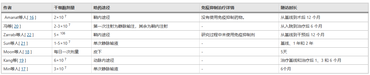 本研究嚴格遵循系統綜述指南,從最初檢索到的142篇文獻中,經過逐層篩選,最終納入了7項符合標準的研究進行最終評估。這7項研究的信息見表1;圖1,表2還報告了所審查研究中的干細胞劑量、給藥途徑、免疫抑制細節和隨訪時間長度的信息。