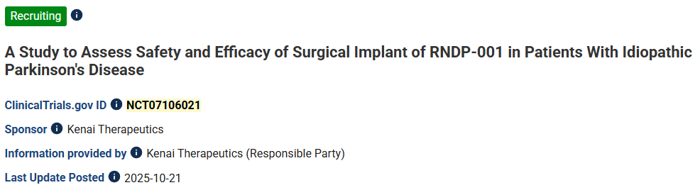 2025年12月16日,Kenai公司在帕金森病細胞療法I期臨床試驗中為首位患者給藥。預計2026年將公布參與者的耐受性、安全性和腦成像方面的初步數據。