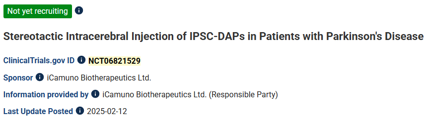 研究設計:一項開放標簽試驗,將患者自體來源的誘導多能干細胞(iPSCs)衍生的多巴胺能祖細胞(由患者自身血細胞生成)移植到患者體內。試驗將招募6名患者,所有患者均接受相同數量的細胞(劑量未公開),通過殼核內注射的方式進行移植。試驗對象為年齡在55至80歲之間、確診帕金森病至少5年的帕金森病患者。