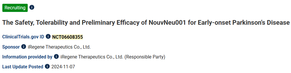 10、標題:NouvNeu001治療早發性帕金森病的安全性、耐受性和初步療效