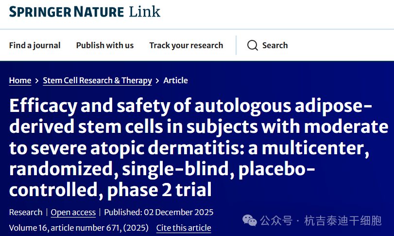 特應性皮炎的研究現狀:2025年12月,《Stem Cell Research&Therapy》期刊發表了一項題為“自體脂肪干細胞治療中重度特應性皮炎患者的療效和安全性:一項多中心、隨機、單盲、安慰劑對照的II期試驗”的研究論文。