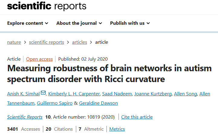 [5]:Simhal AK, Carpenter KLH, Nadeem S, Kurtzberg J, Song A, Tannenbaum A, Sapiro G and Dawson G: Measuring robustness of brain networks in autism spectrum disorder with Ricci curvature. Sci Rep. 10:108192020. View Article : Google Scholar : PubMed/NCBI