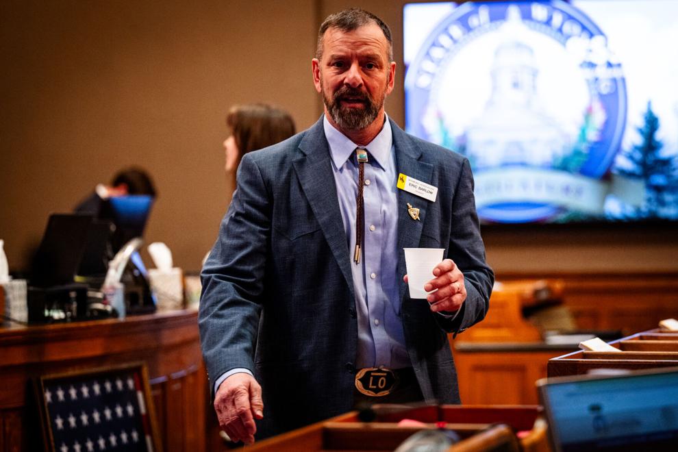 2月10日,在懷俄明州議會預算會議第二天召開之前,來自吉列的共和黨參議員埃里克·巴洛在州議會大廈走回他在參議院議事廳的座位。