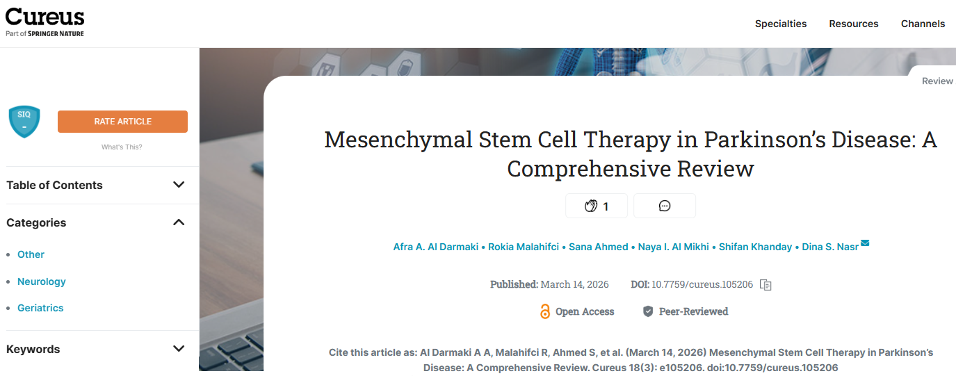 [1]:Al Darmaki A A, Malahifci R, Ahmed S, et al. (March 14, 2026) Mesenchymal Stem Cell Therapy in Parkinson’s Disease: A Comprehensive Review. Cureus 18(3): e105206. doi:10.7759/cureus.105206