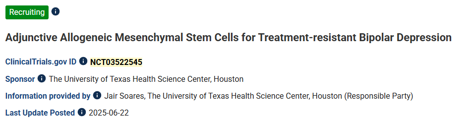 該研究為首次在治療抵抗性雙相抑郁人群中系統評估MSCs療效的隨機對照試驗,其結果將對干細胞治療難治性心境障礙的臨床轉化具有重要意義。