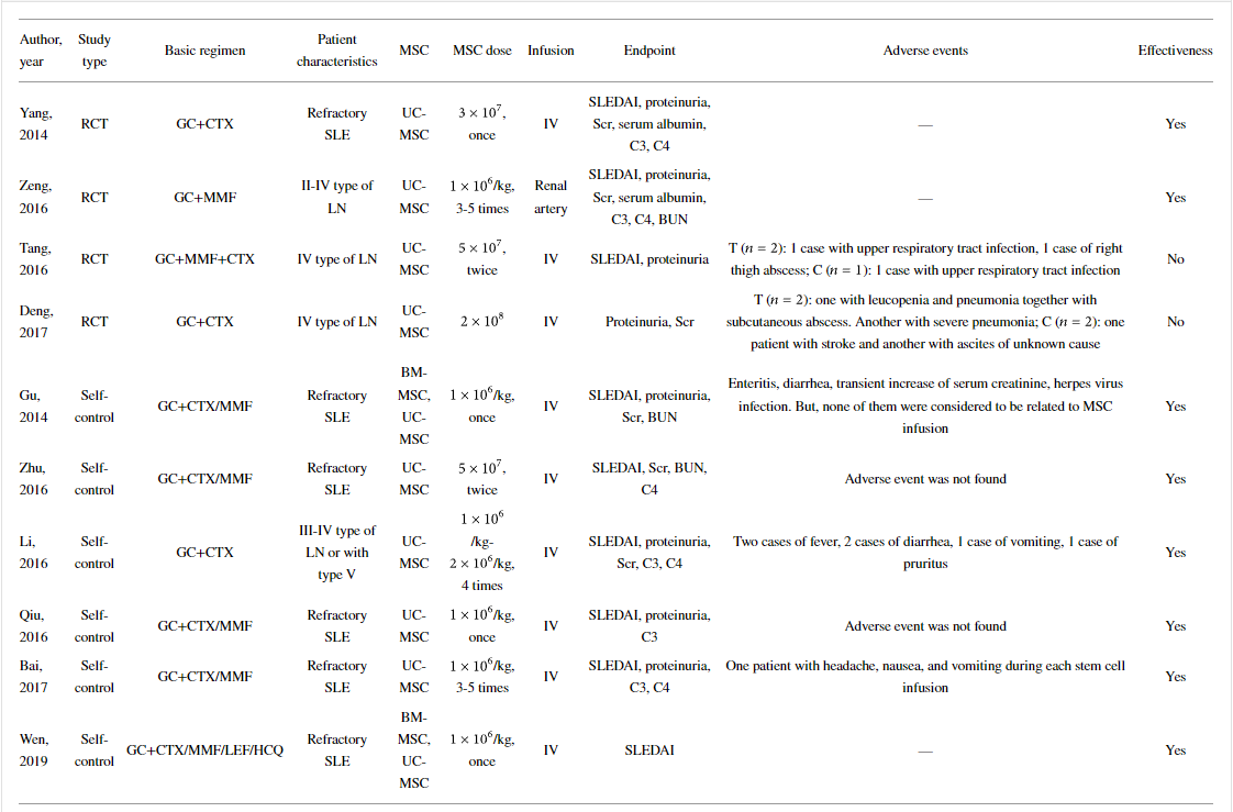 結果:在RCT中,結果表明MSC組在3個月和6個月時的蛋白尿低于對照組,MSC組在2個月和6個月時顯示出低于對照組的 SLEDAI。此外,, 95% CI: 0.07, 0.89,). 在病例系列試驗中,結果表明MSC組在1個月、2個月、3個月、4個月、6個月和12個月時蛋白尿較低??傊?,間充質干細胞可能是SLE患者有前途的治療藥物。