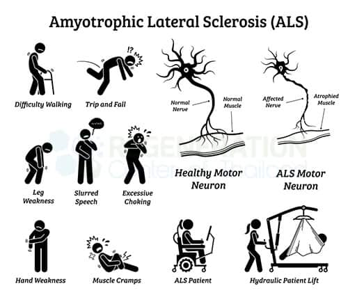 由于上、下運動神經元的快速變性,ALS等神經退行性疾病通常會導致肌肉萎縮、神經性疼痛、肌肉痙攣、頻繁肌肉痙攣等。 全身抽筋或痙攣。這些癥狀經常被誤認為是周圍神經病變等其他疾病,隨著時間的推移,ALS患者會失去控制自主運動、排便功能、呼吸衰竭以及負責眼球運動的眼外肌的使用能力。ALS不被認為是自身免疫性疾病的一個例子,盡管一些醫學研究人員認為它可能是,部分原因是看似雜亂無章的免疫反應和氧化應激。